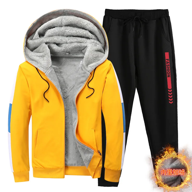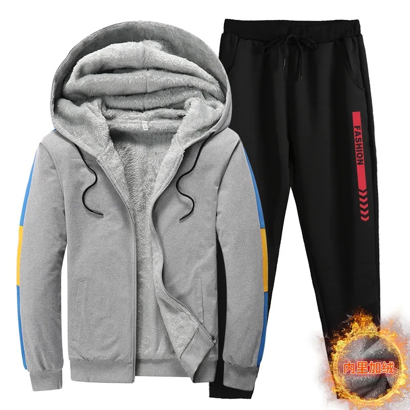 New Men Sport Set Warm Thick Hooded Tracksuit Lined Thick Sweatshirt + Pants Running Sportswear Sui