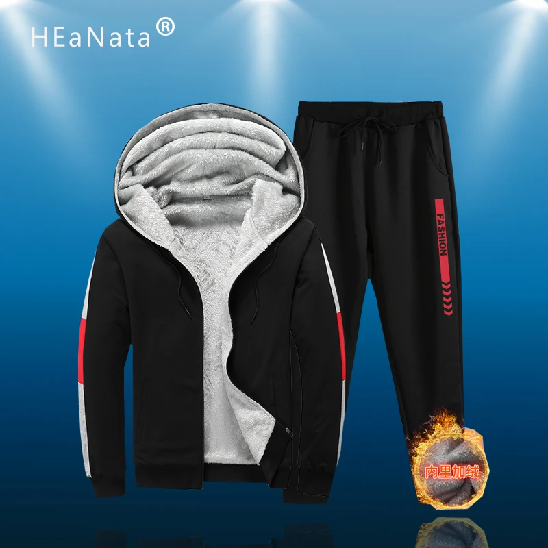 Best Quality New Men Sport Set Warm Thick Hooded Tracksuit Lined Thick Sweatshirt + Pants Running Sportswear Sui